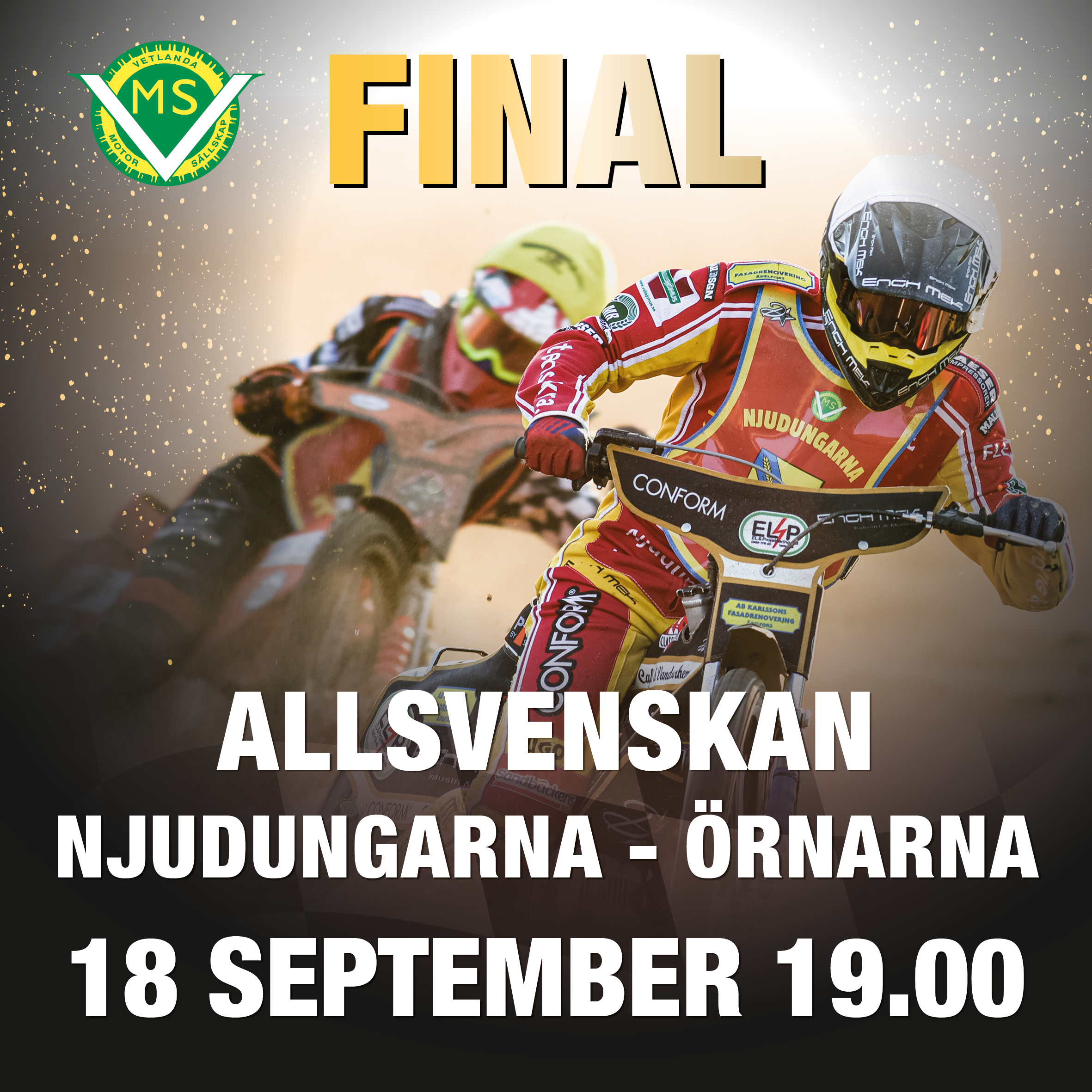Efter förra veckans inställda finalomgång är det dags för nytt försök nu på torsdag den 18 september. Vädret är lite svajigt även denna vecka så vi håller alla trummar och tår för att vi är på rätt sida av millimetrarna denna gång. Njudungarna tar i första mötet emot Örnarna hemma på Vetlanda Motorstadion och det kommer bjudas på förstklassig speedway och en kamp om poängen för att ta det hägrande guldet.